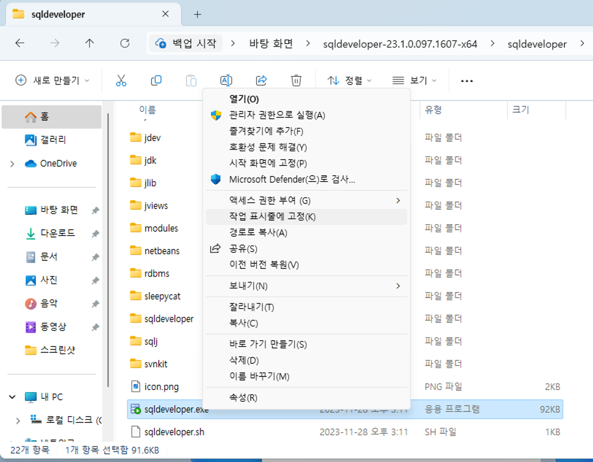 6. 'sqldeveloper.exe ' ํ์ผ ์์ฝ๊ฒ ์ ๊ทผํ๊ธฐ ์ํด ์์